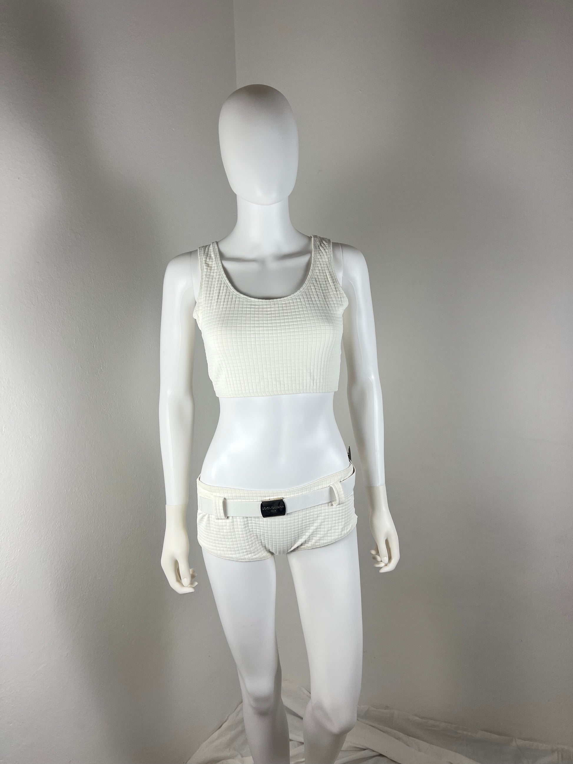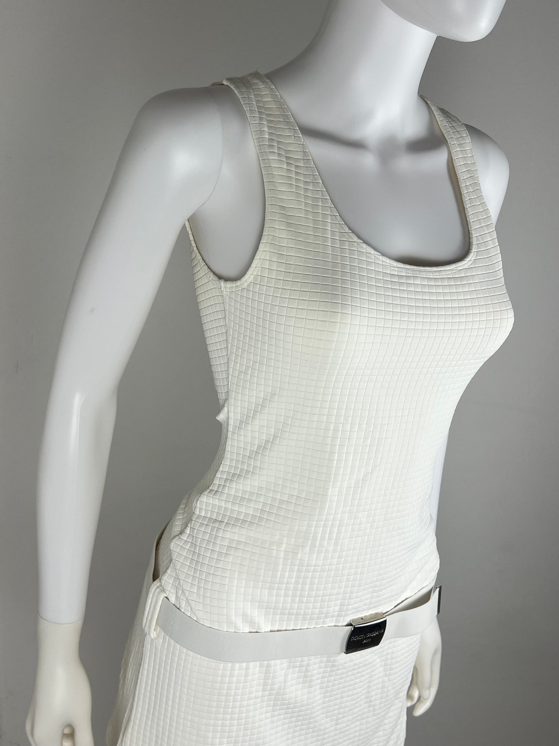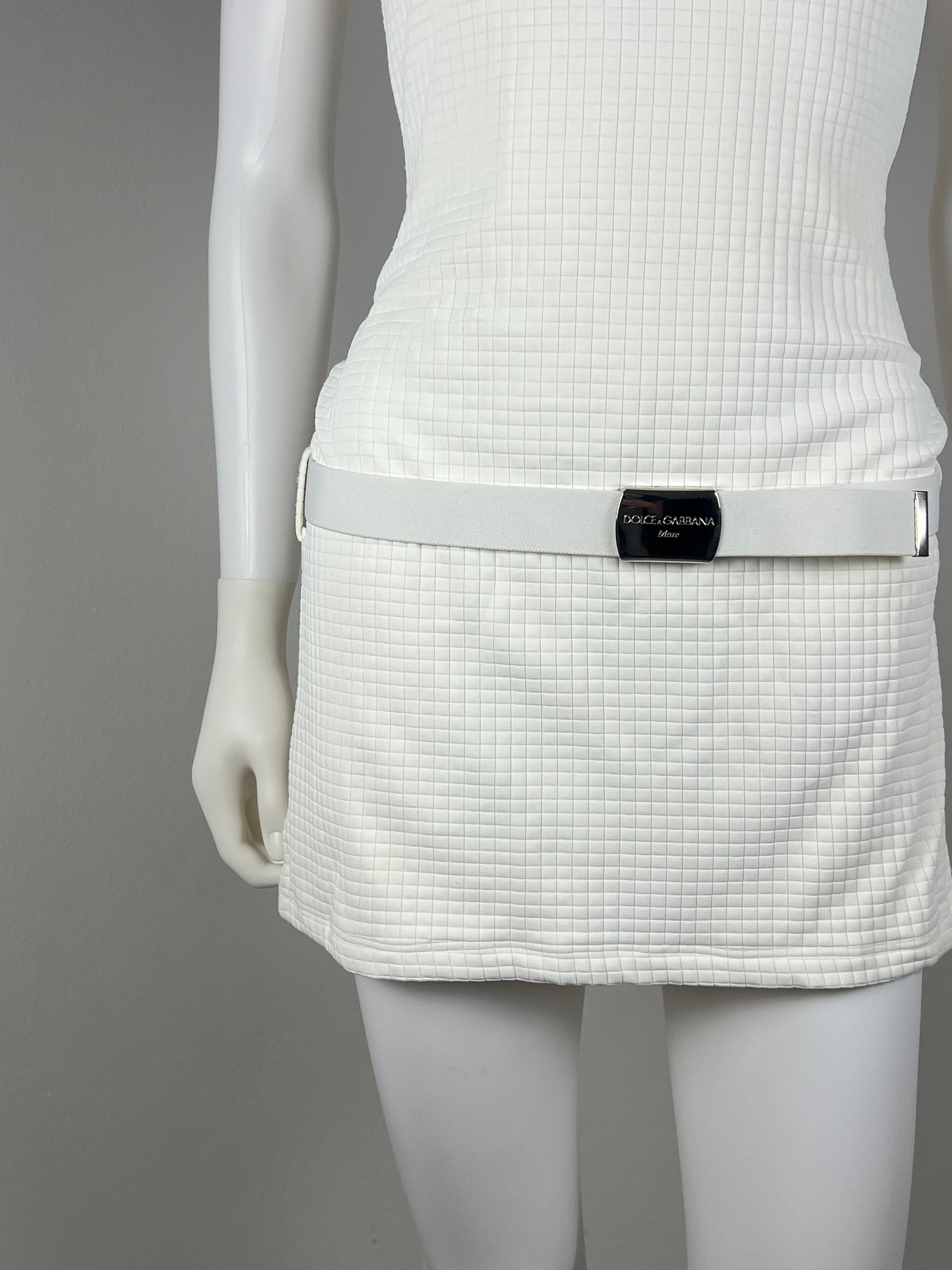 In crisp white with a subtle quilted texture, the silhouette is clean, sensual and unmistakably archival D&G. The belt detail elevates the set from resortwear to collectible fashion, a signature detail rarely found intact across all pieces.