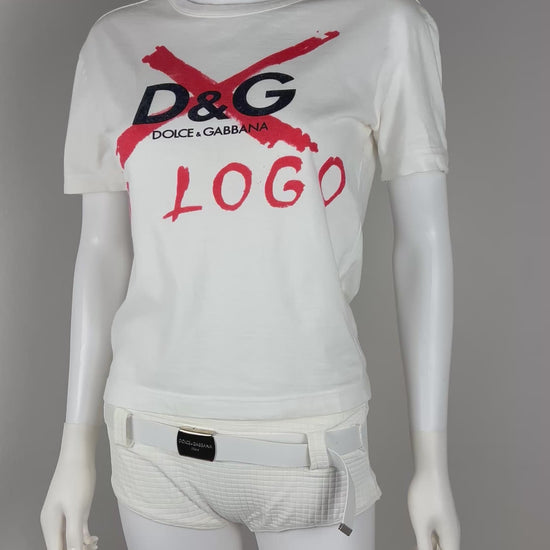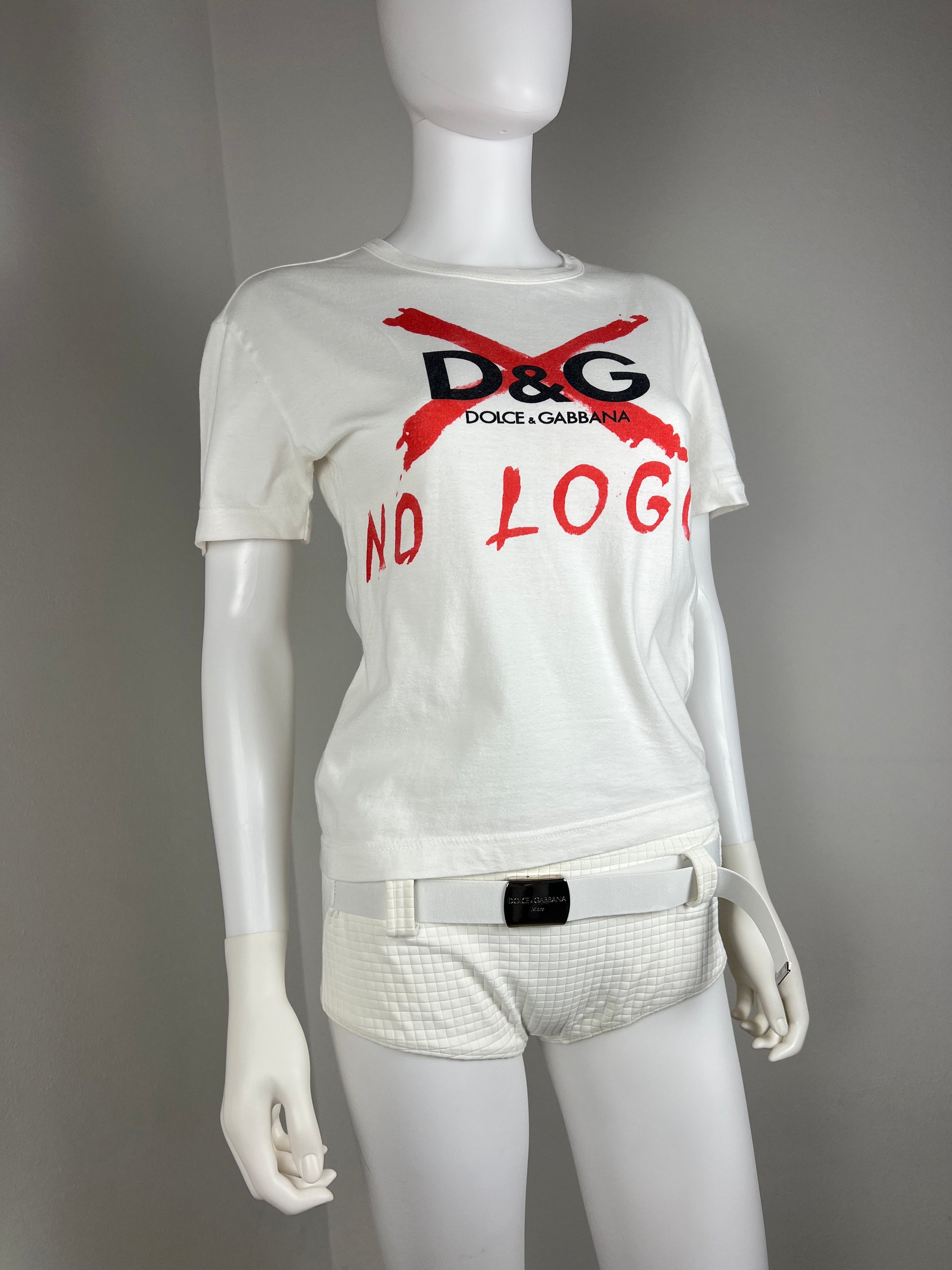 A bold anti-branding statement from the rebellious D&G archives, this rare tee subverts logo culture with raw brushtroke lettering that crosses out the brand itself. A stark red 'X' and "NO LOGO" graphic over the D&G monogram, it captures early 2000s street energy and conceptual irony.