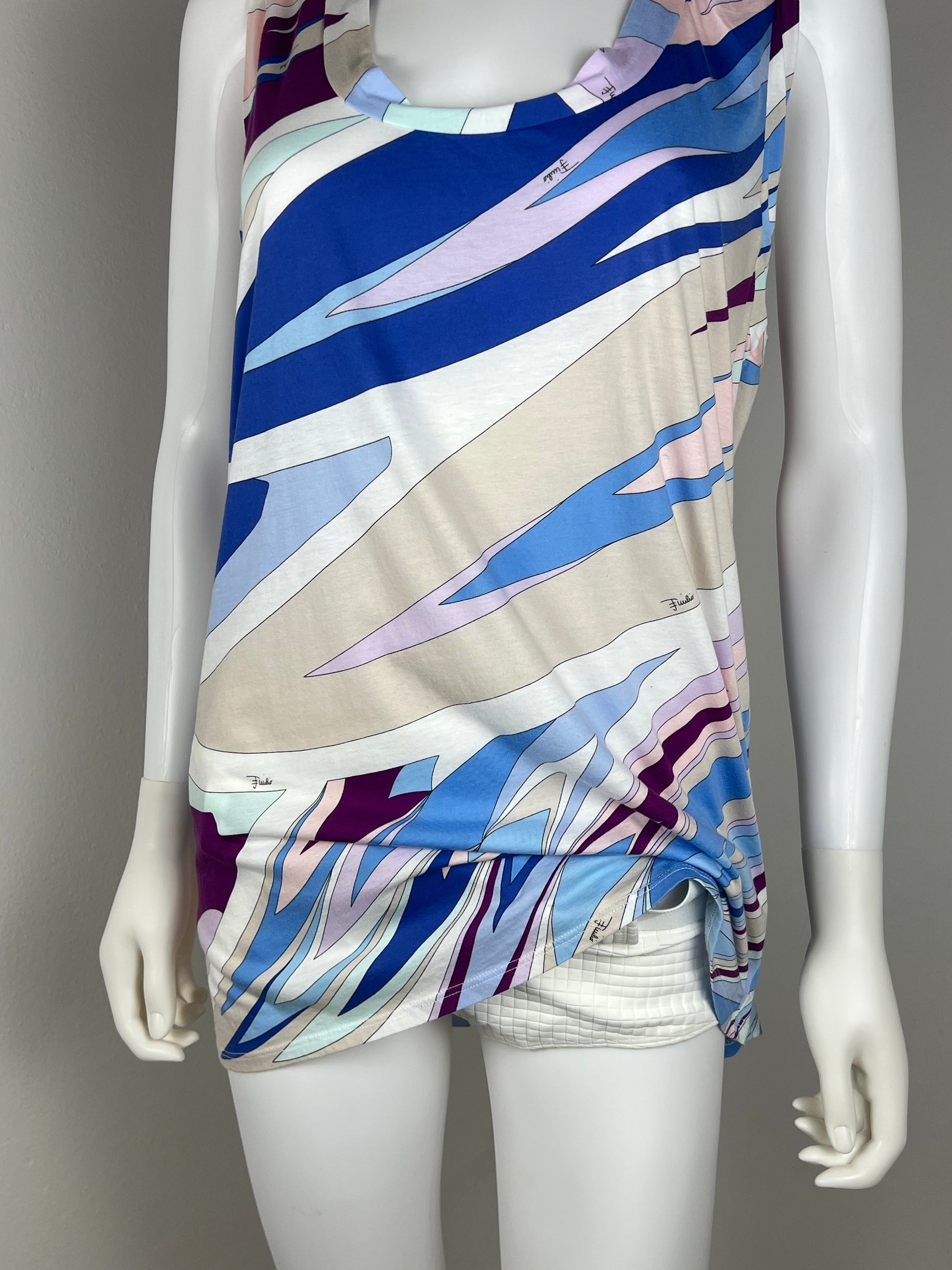 Iconic Pucci energy in a fluid jersey silhouette. Swirling wave print in layered blues, lilac, sand, and deep plum, with an easy scoop neckline and relaxed drape. Works as a longline top or a mini dress depending on how you style it. Effortless, graphic, and unmistakably Pucci.
