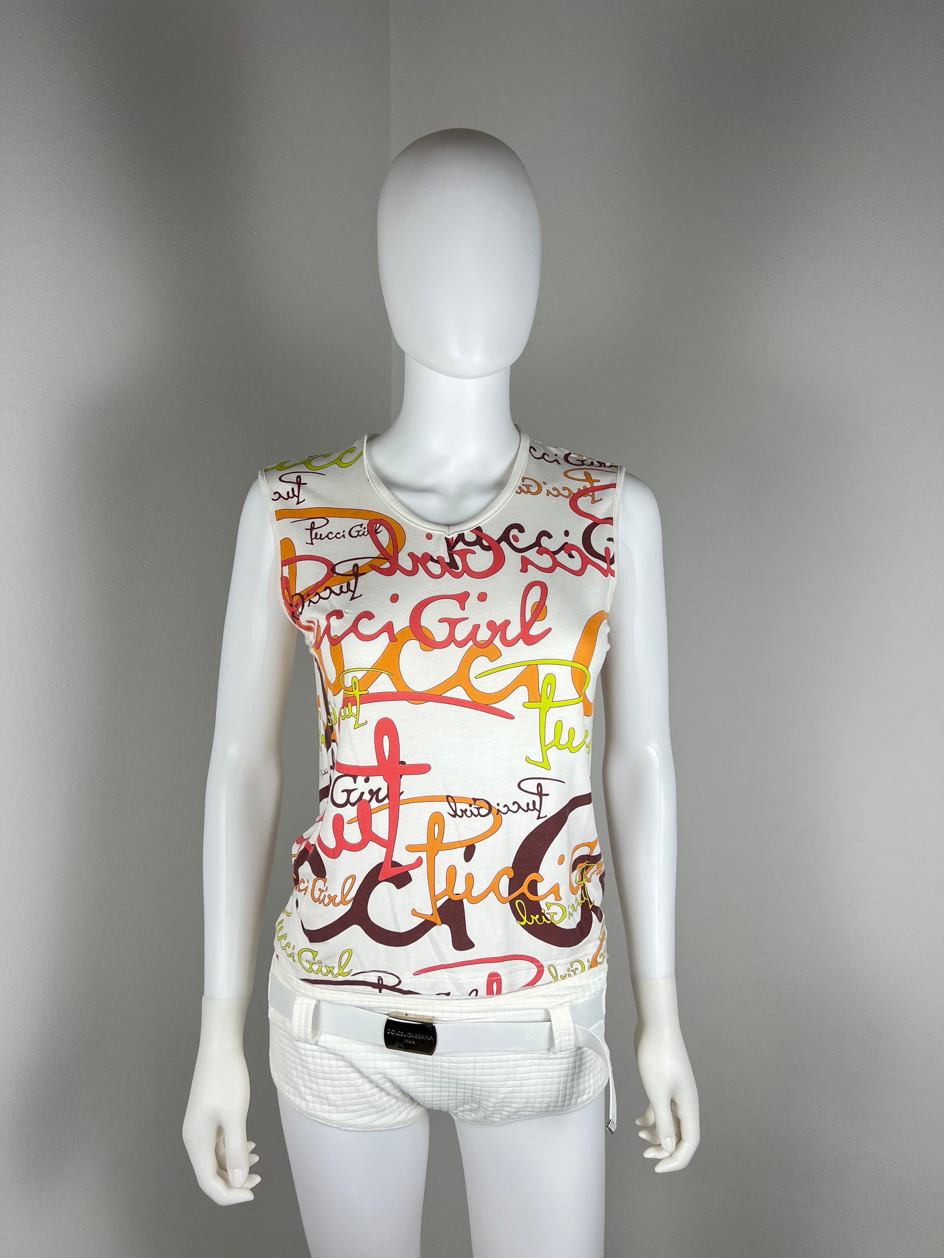 An iconic Pucci Girl sleeveless top from the early–mid 2000s, featuring the house’s playful, graphic logo typography layered across a soft neutral base. Bold yet effortless, this piece captures Pucci’s flirtation with pop colour and youthful energy during one of its most recognisable eras.
