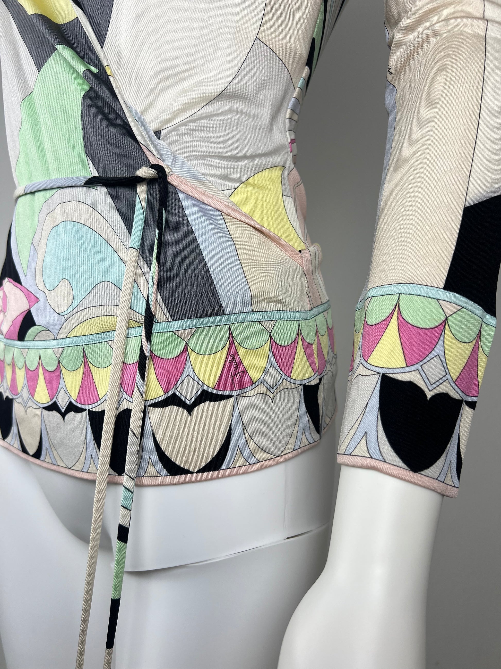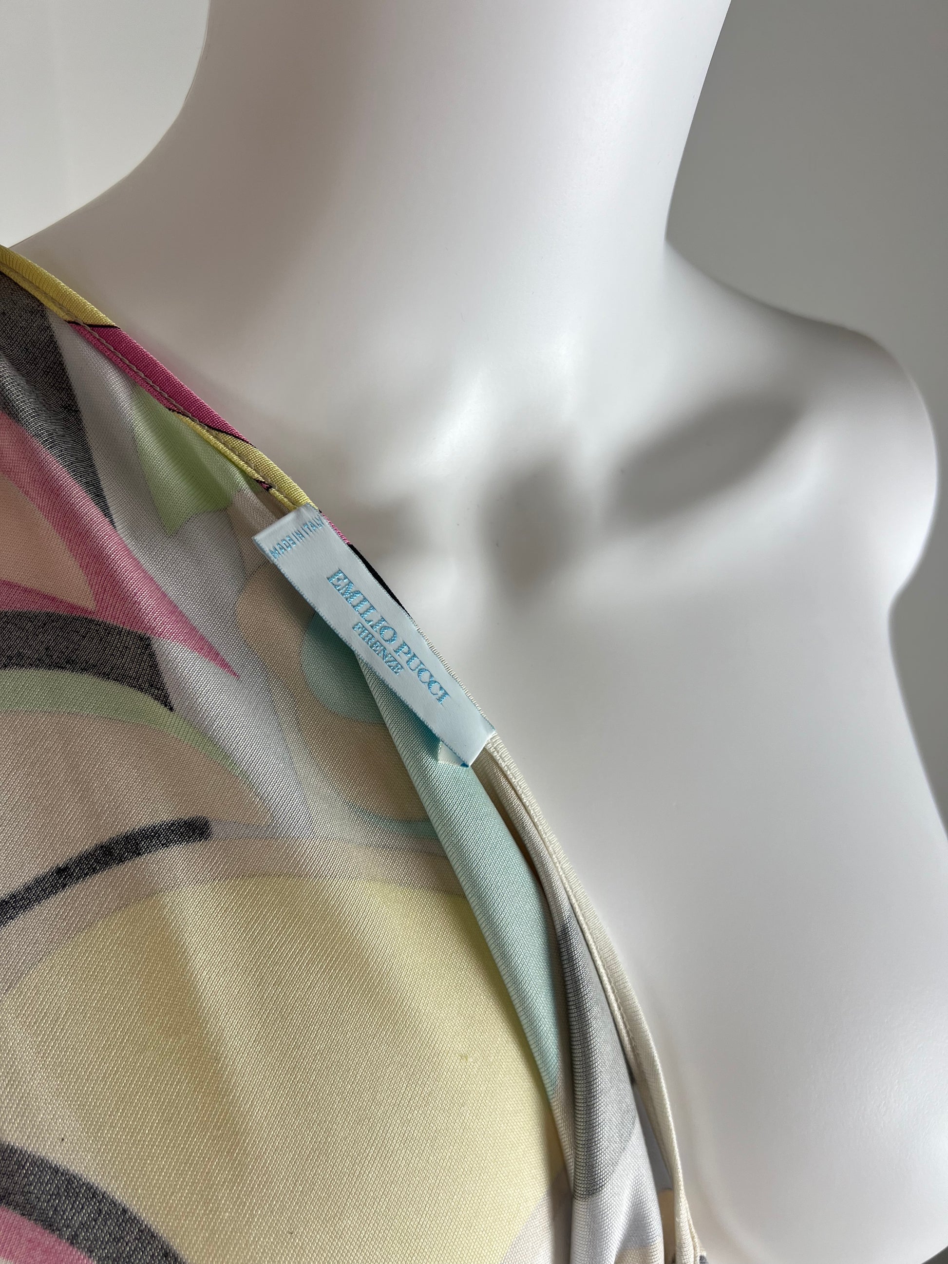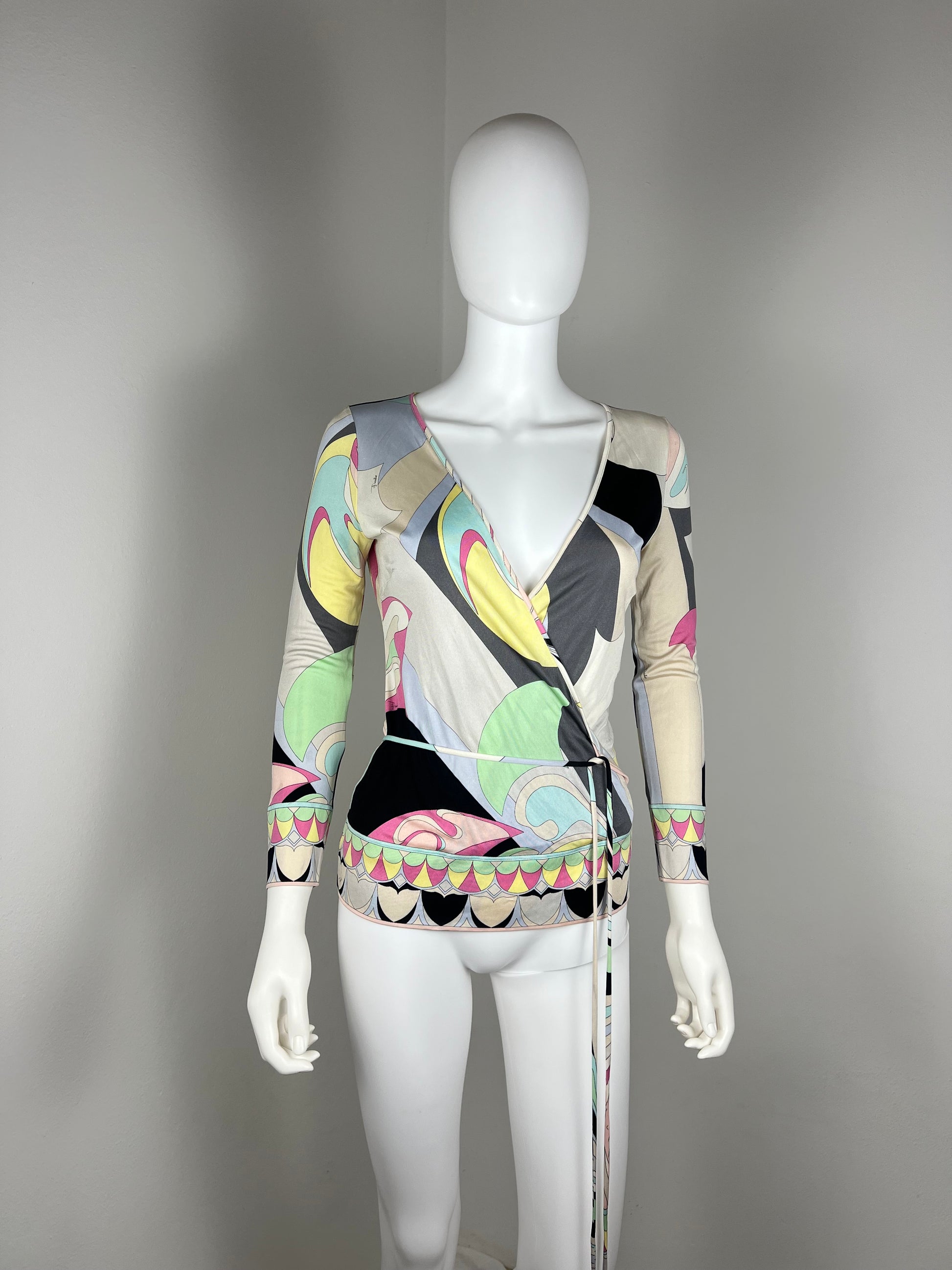 Iconic Pucci swirl print in soft pastel tones, cut in a flattering wrap silhouette with a slim tie waist. Lightweight silk jersey that drapes close to the body and moves beautifully. A classic early-2000s Pucci piece that works just as well styled casually as it does dressed up.