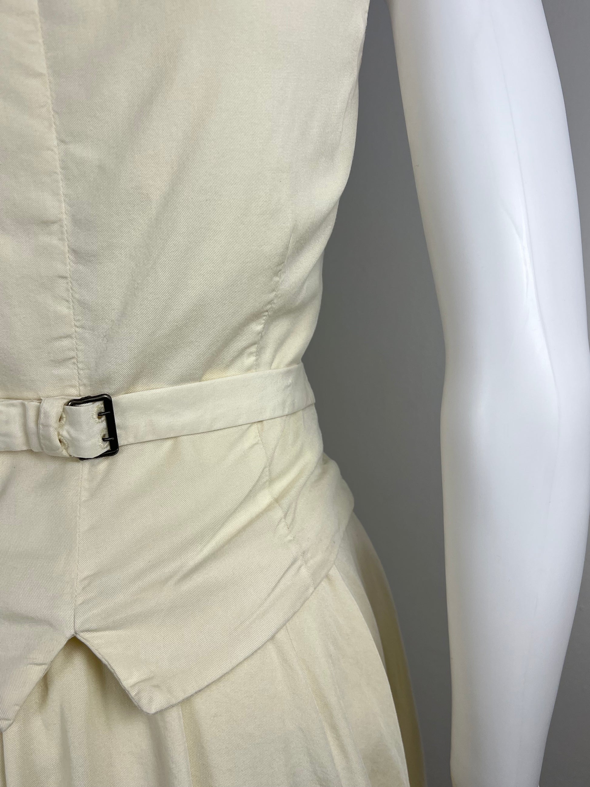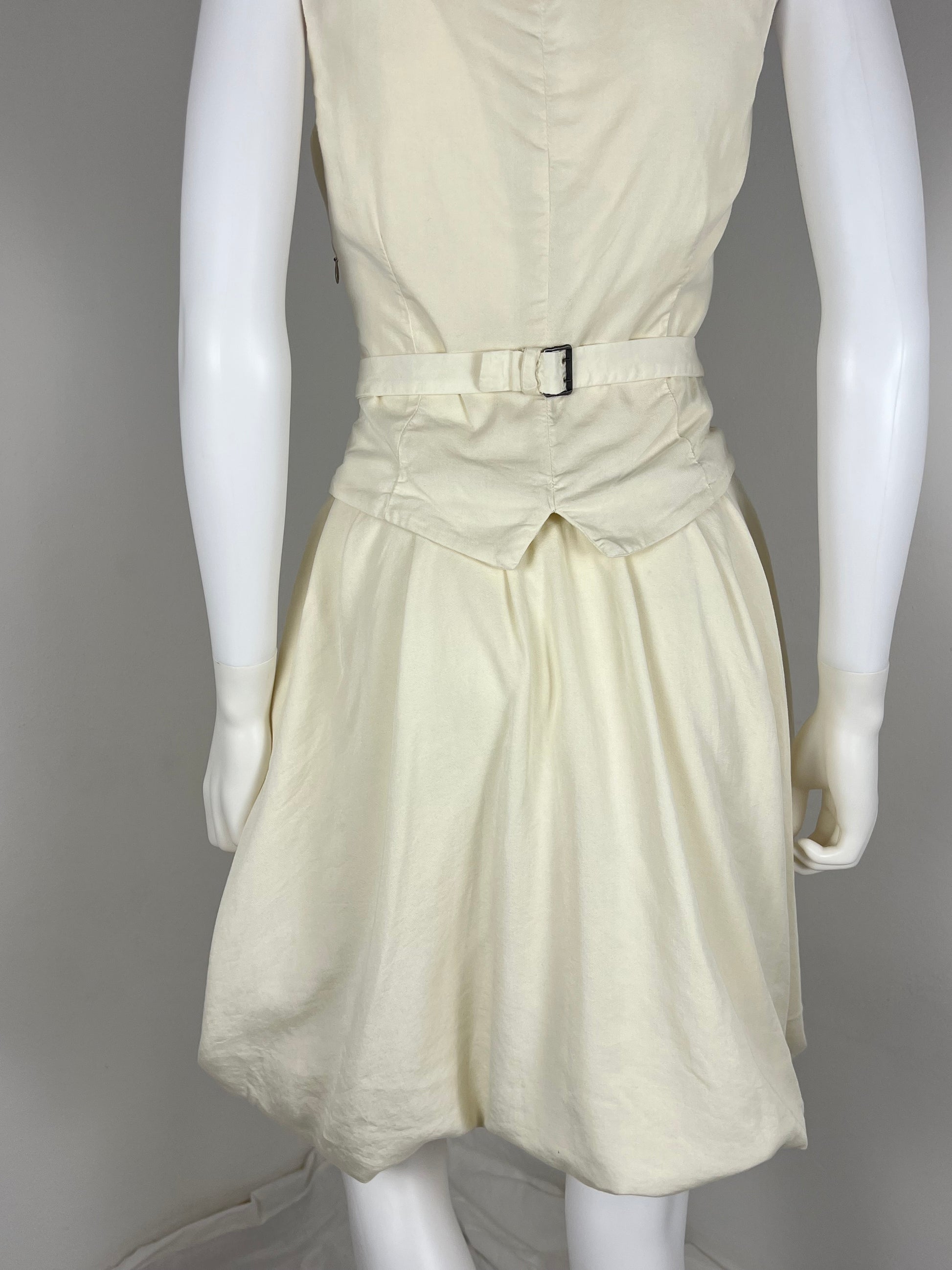 Early 2000s Jean’s Paul Gaultier in a soft butter tone. Sculpted bodice with tonal buttons and adjustable back belt. Voluminous bubble hem skirt that holds shape without stiffness. Light, fluid, architectural.