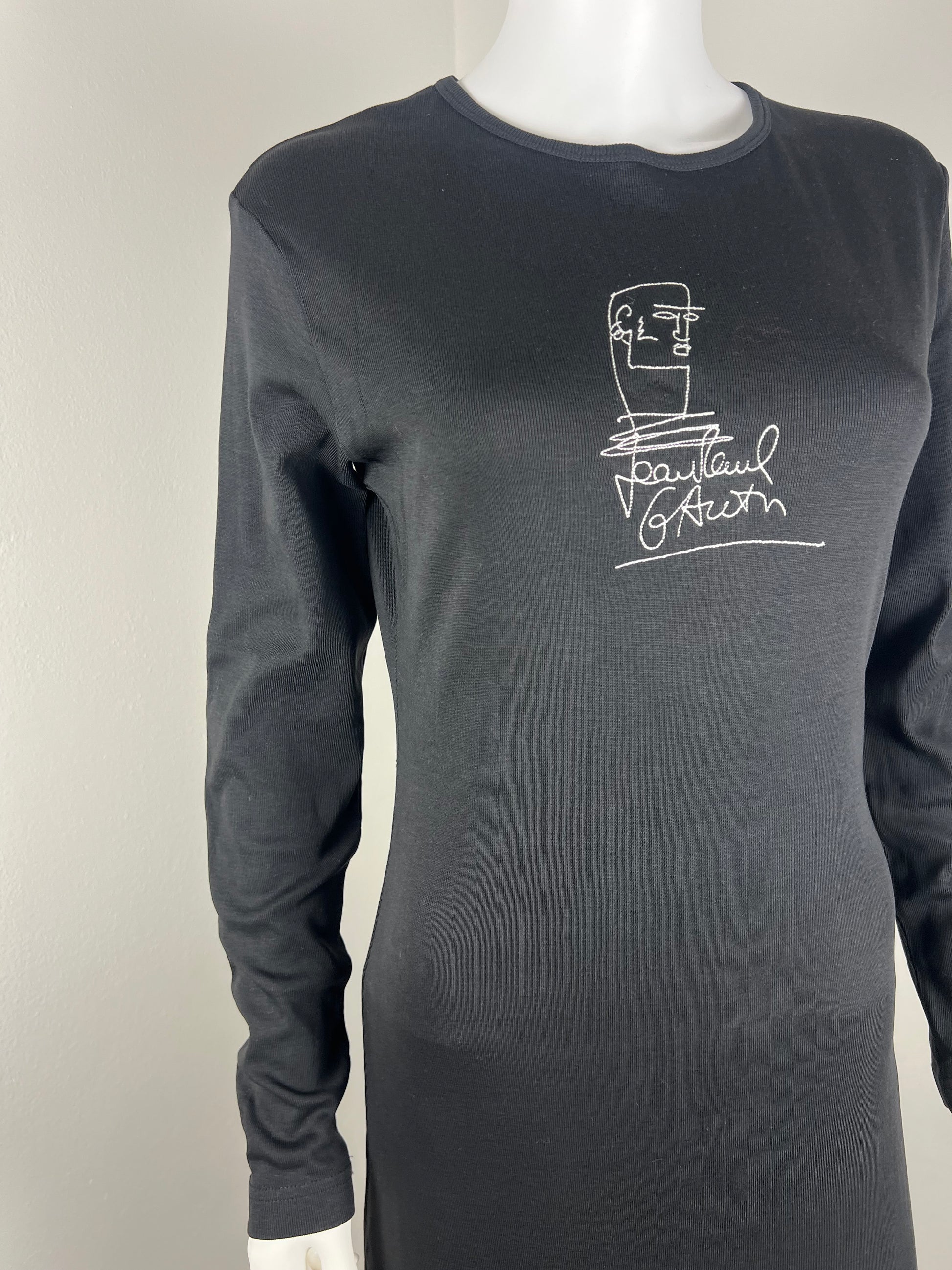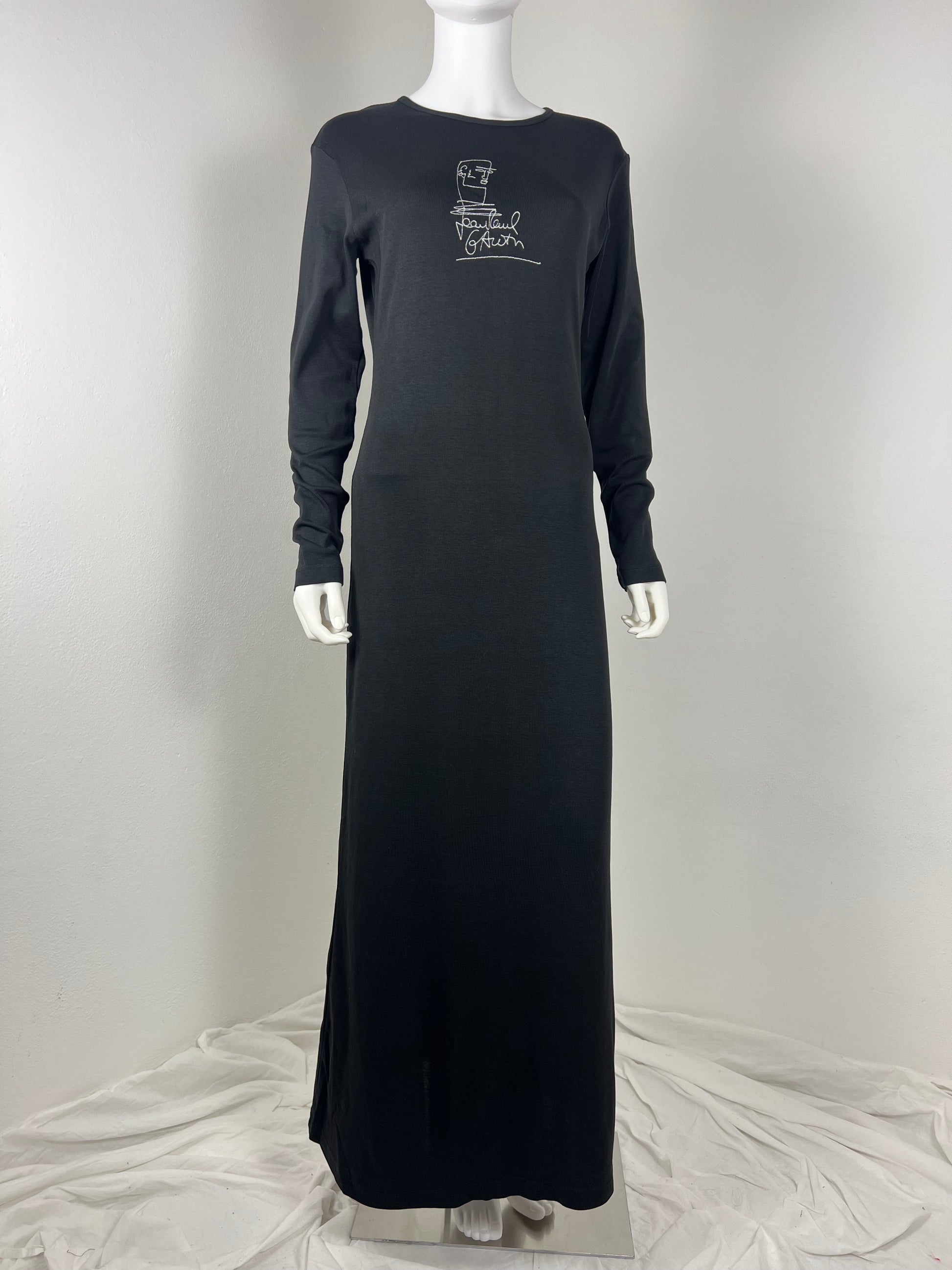 Black long-sleeve jersey maxi dress with Jean Paul Gaultier’s iconic line-drawn face and signature embroidered at the chest. Slim, column silhouette with a soft stretch and elongated proportions. Minimal, graphic, unmistakably Jean Paul Gaultier.