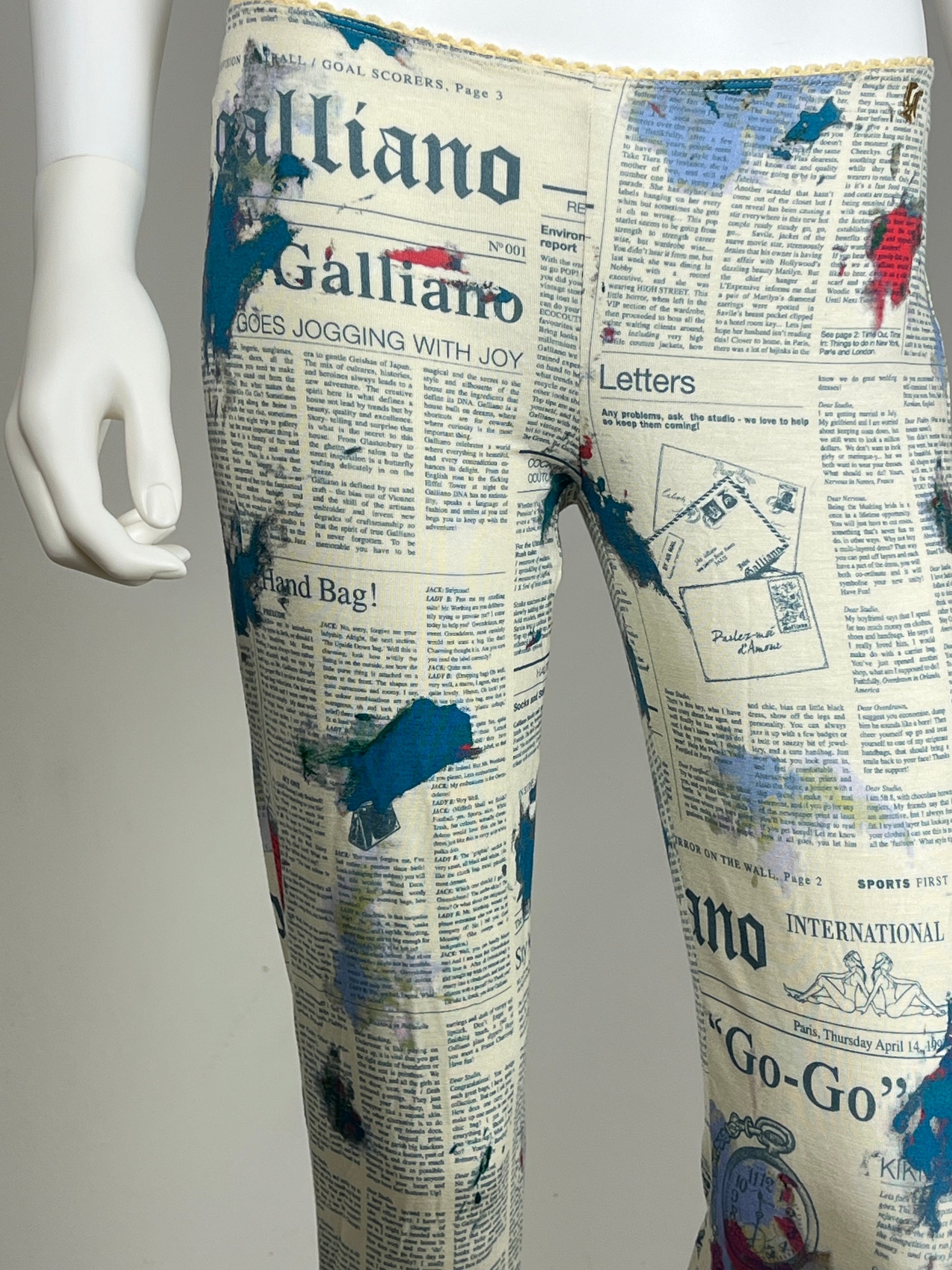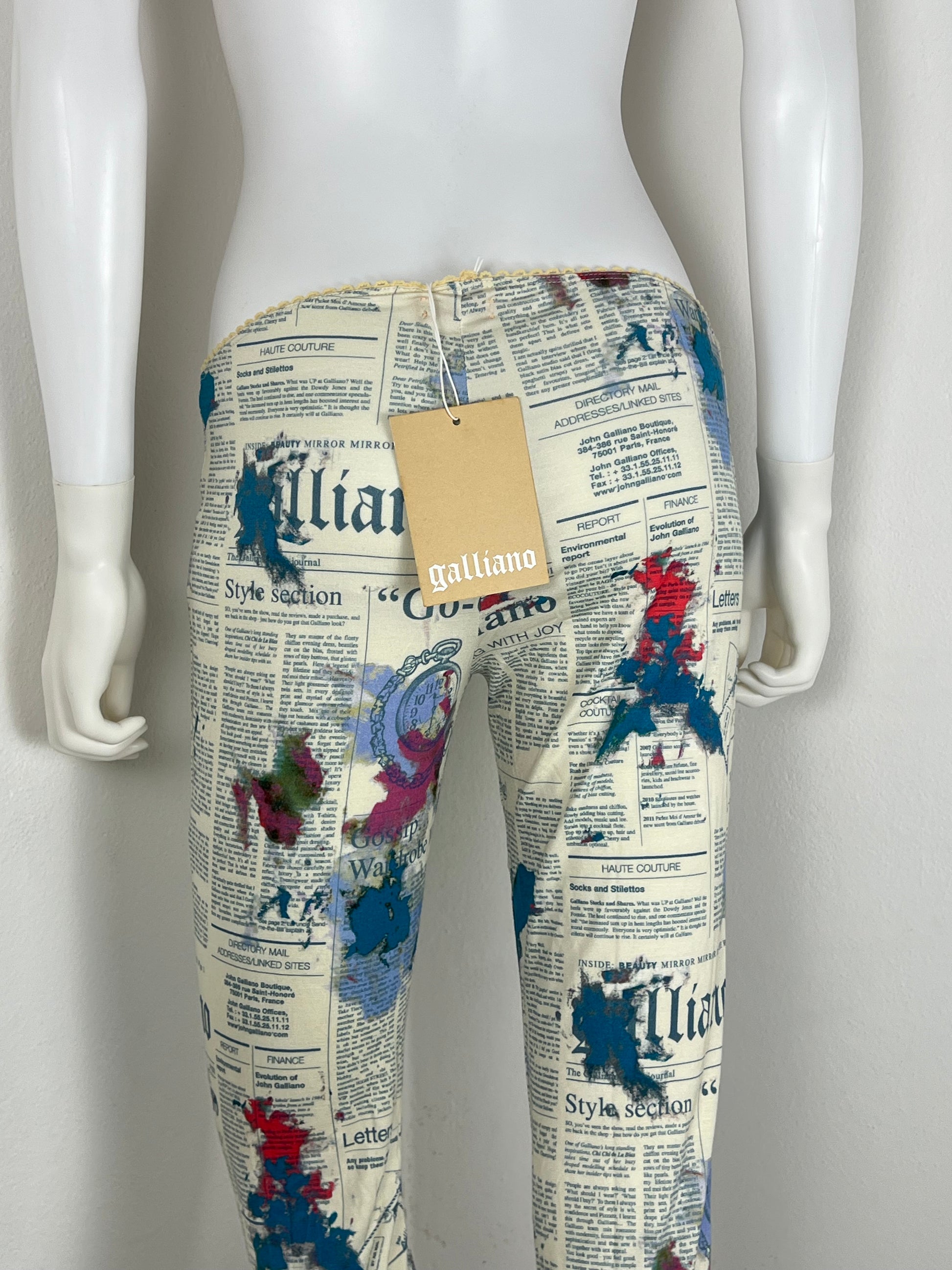 Iconic John Galliano stretch leggings in the house’s signature newspaper print, splashed with painterly colour accents. A defining early-2000s Galliano motif. Instantly recognisable. Carrie Bradshaw.