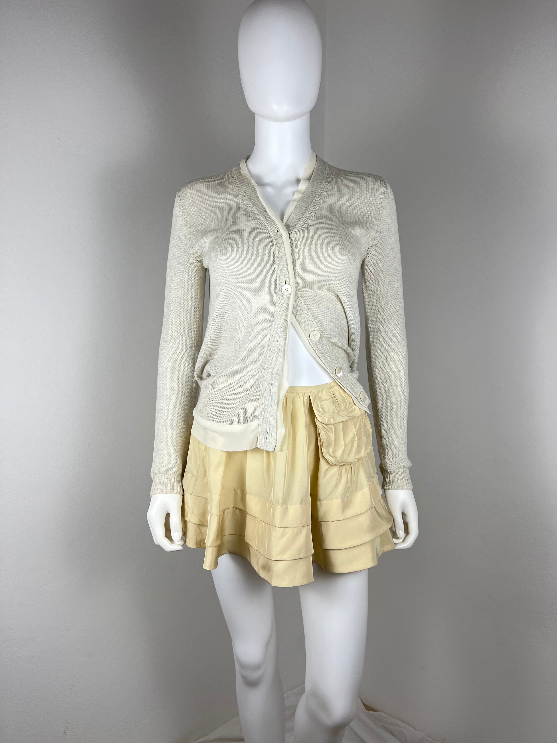 Early-2000s Miu Miu silk mini skirt in a soft cream tone, designed with an easy A-line shape and soft tiered volume. The understated pocket detail at the hip adds that signature Miu Miu twist, playful, slightly unexpected, and very of its time. Lightweight and fluid, it sits effortlessly at the waist and moves beautifully on the body. A rare archival piece that feels both nostalgic and current, perfect styled simply or contrasted with something oversized.