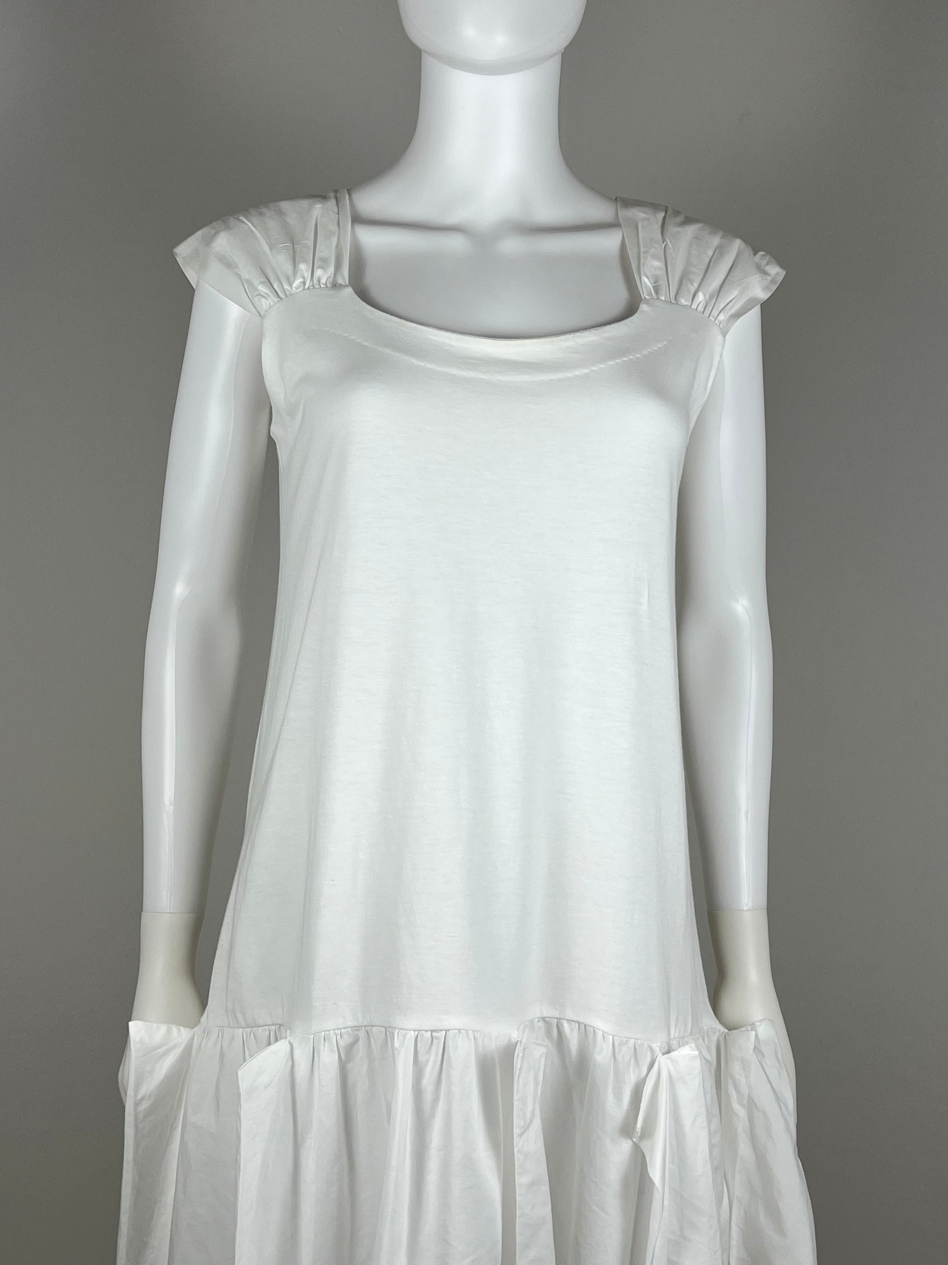 Soft white Miu Miu dress with a relaxed silhouette and subtle volume. Scoop neckline with lightly gathered cap sleeves, fluid cotton jersey body, finished with a crisp drop-waist skirt panel. Quietly playful, very Miu Miu.