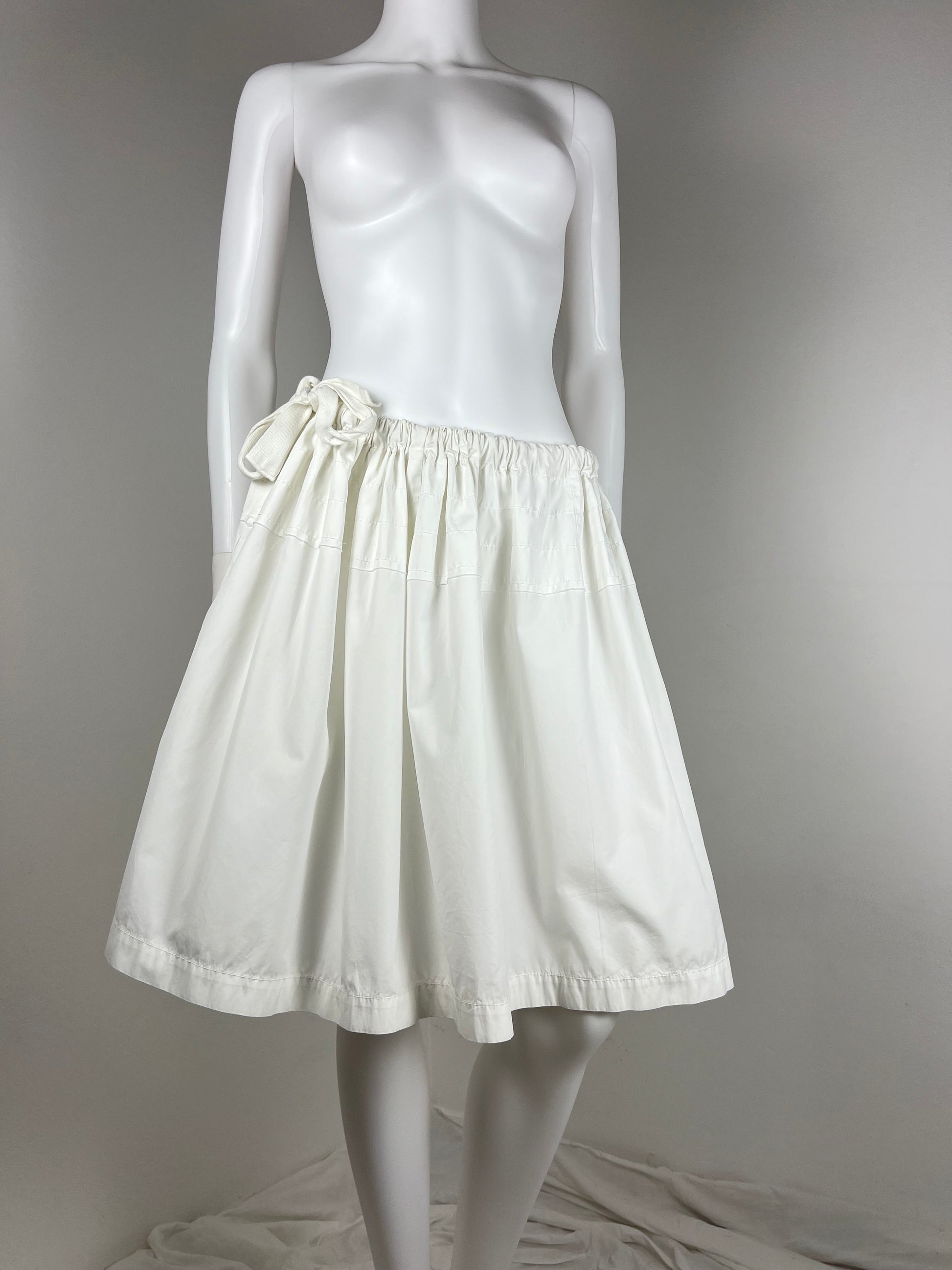 A softly structured Nina Ricci skirt in ivory silk. Elasticated waist with a delicate side tie, finished with subtle horizontal stitch detailing that gives gentle volume and movement. Quietly romantic and beautifully made.