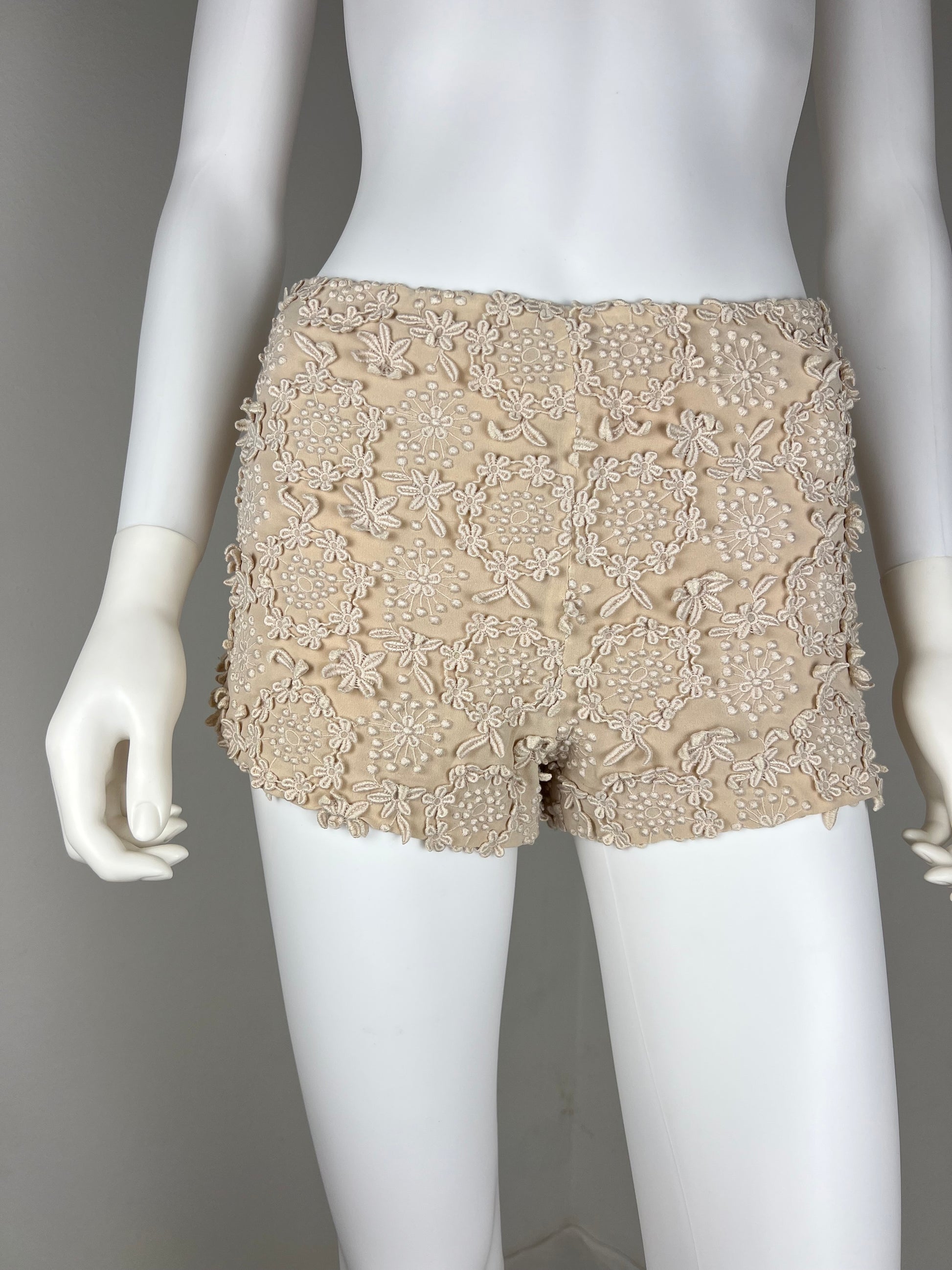 Prada nude-beige shorts in intricate floral embroidery. Lightweight base with raised lacework and scalloped hems. Soft, precise, quietly romantic. Easy contrast with a sharp tank, or with black tights and heels.
