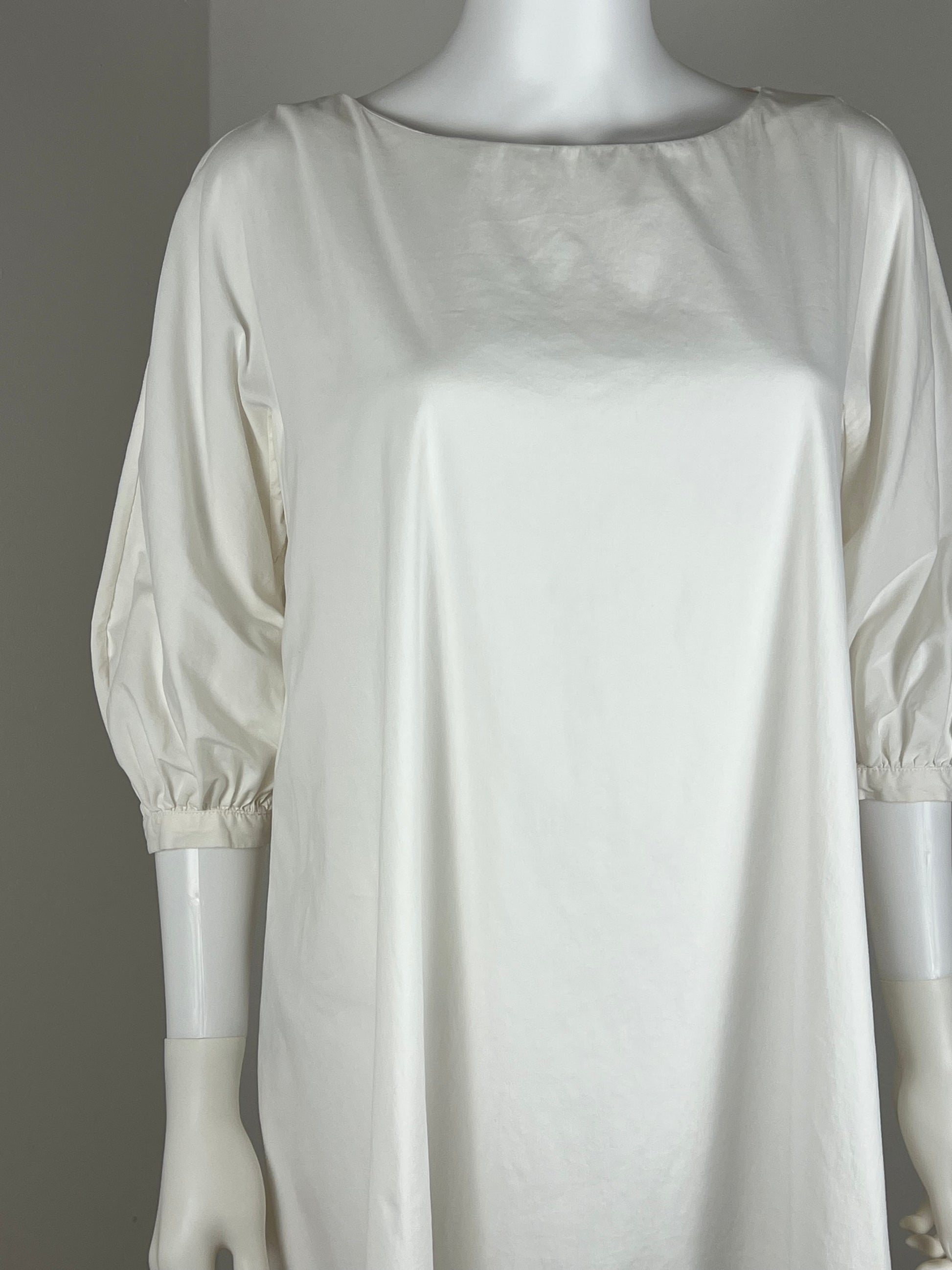 Prada ivory shift dress with soft volume through the body and sculptural puff sleeves. Clean boat neckline, relaxed A-line cut, light structure with a fluid drape. Minimal but the buttery silk mix cotton speak for the quality. The sleeves give it shape without tipping into romantic.