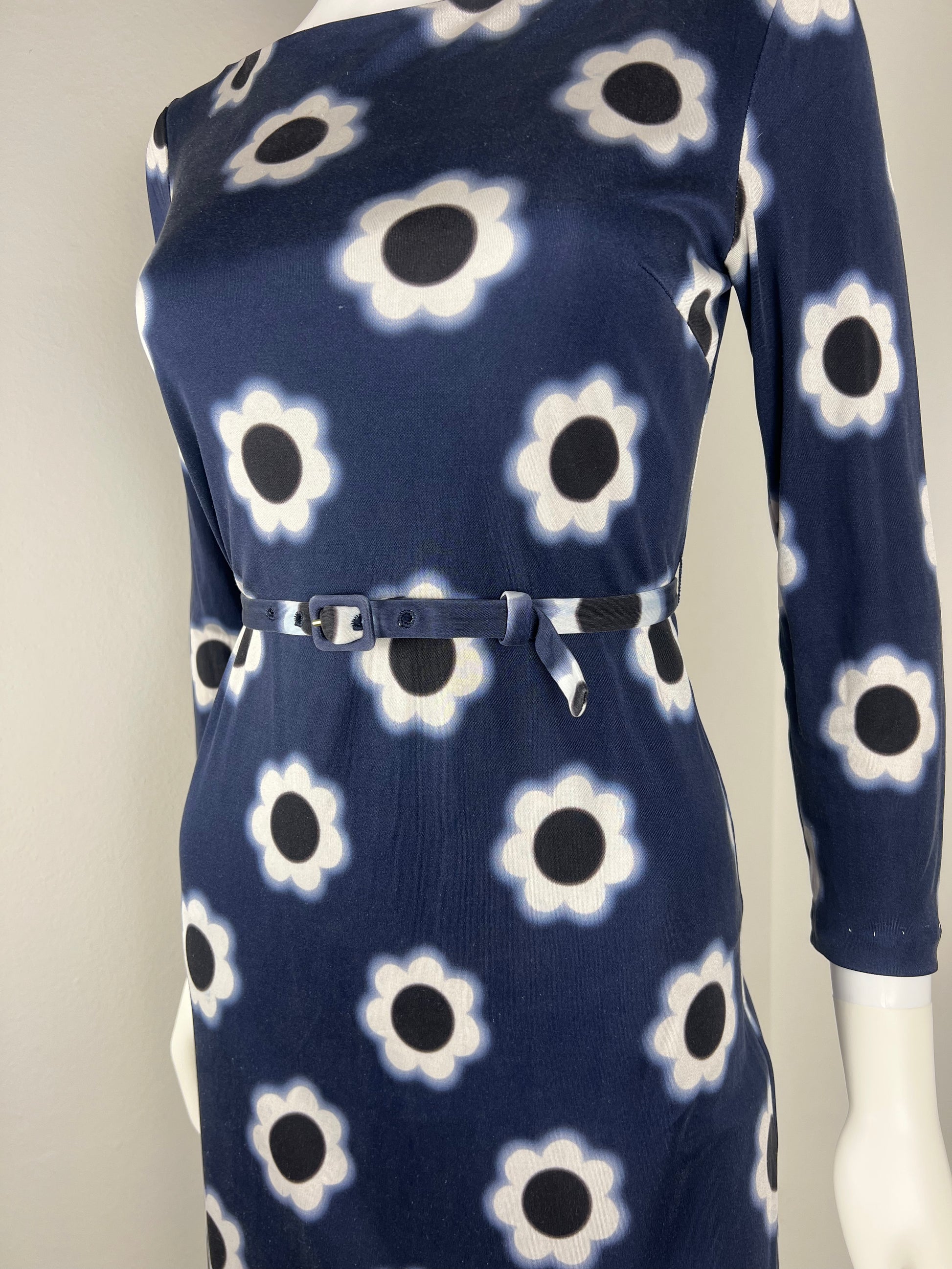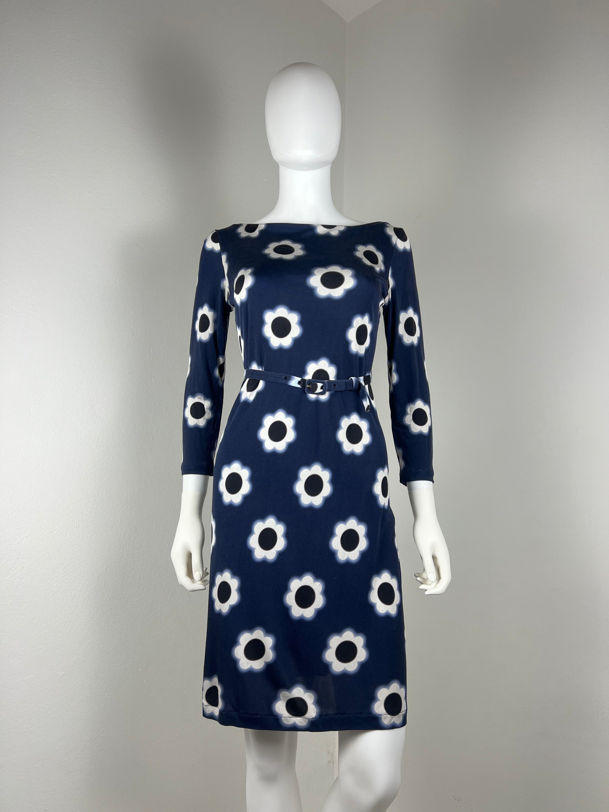A refined floral dress by Prada, dating to the early–mid 2000s era when the house balanced graphic restraint with quiet femininity. Cut in a clean, elongated silhouette with long sleeves and a bateau neckline, the dress is finished with a matching belt that subtly defines the waist.