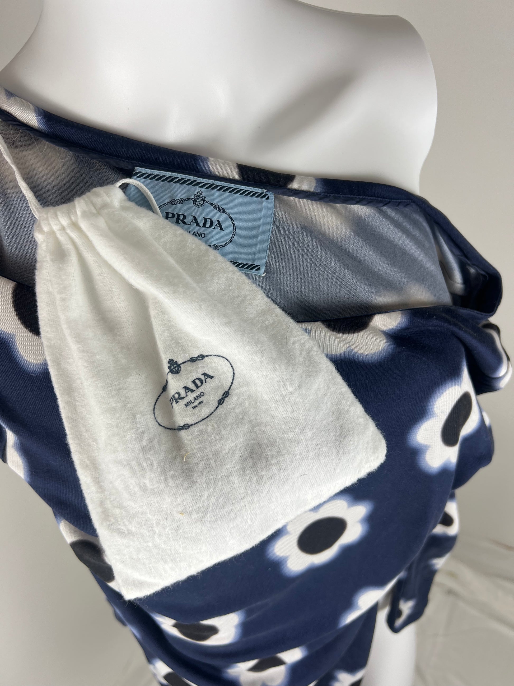 The navy base is punctuated by soft, high-contrast floral motifs, a print language Prada explored repeatedly during this period. Understated yet unmistakably archival, this piece sits comfortably between everyday elegance and collectible design.