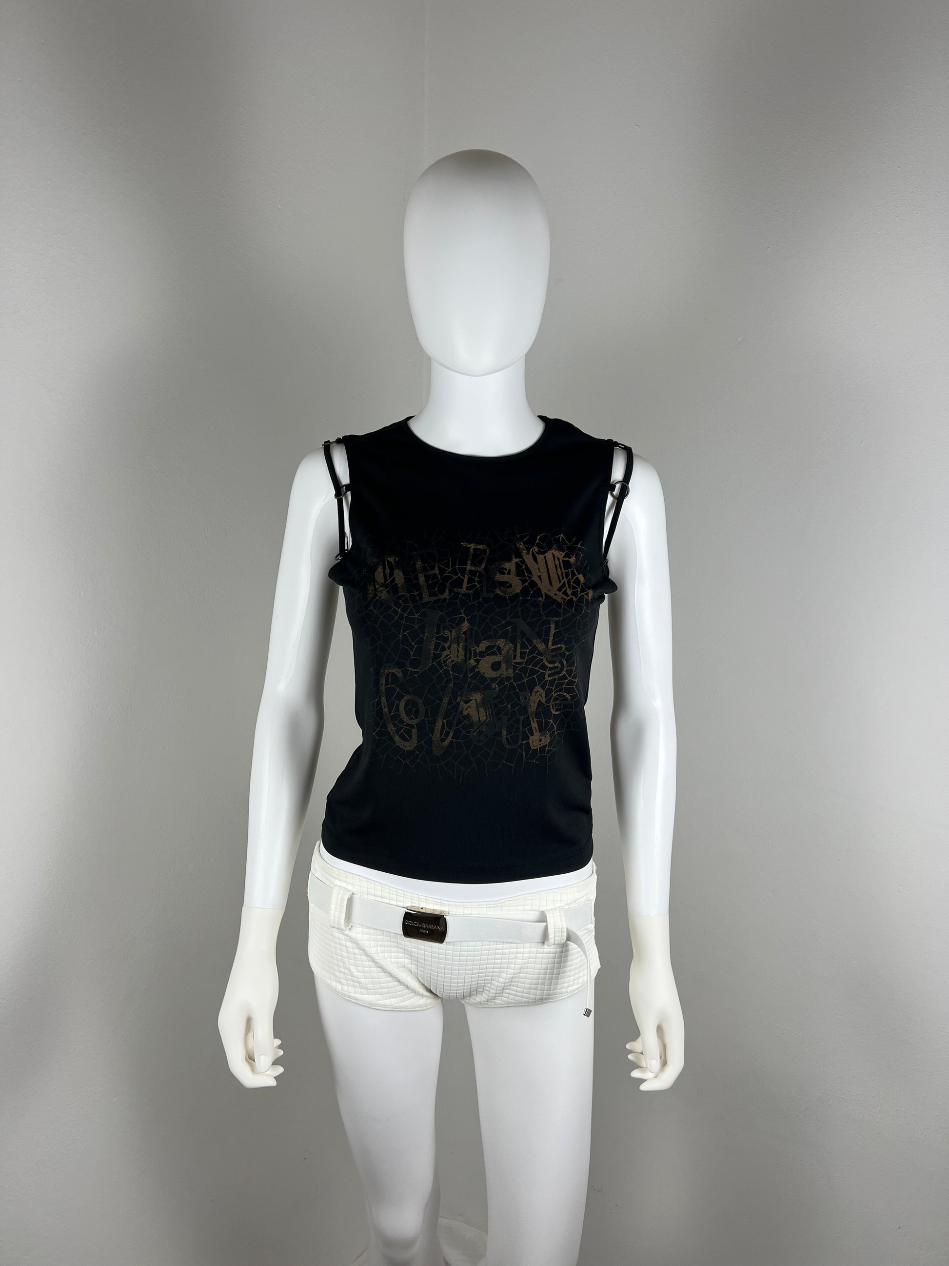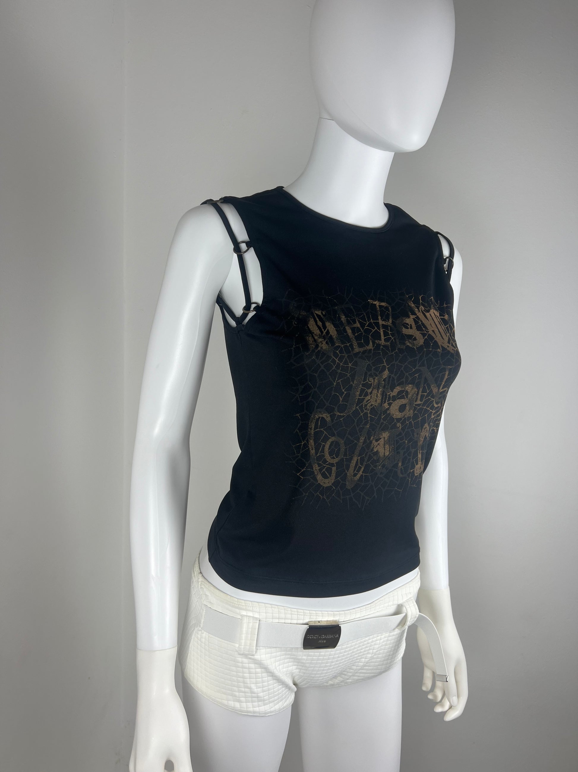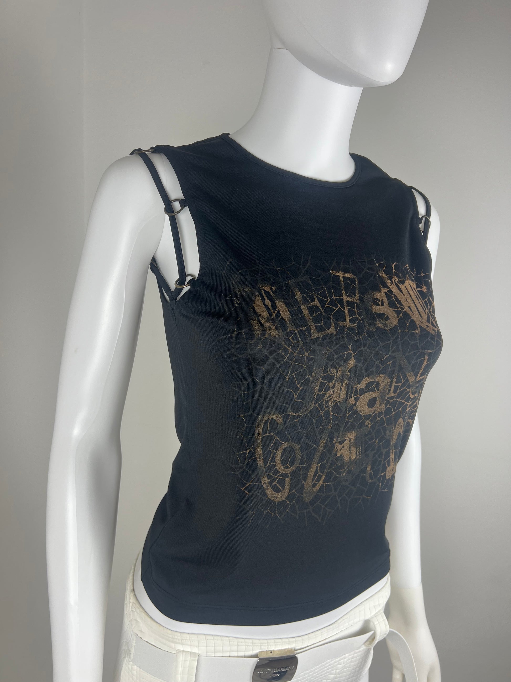 Black sleeveless jersey top with cracked gold Versace logo print. Slim fit with open sides, metal rings and adjustable strap detailing. Graphic, early-2000s energy.