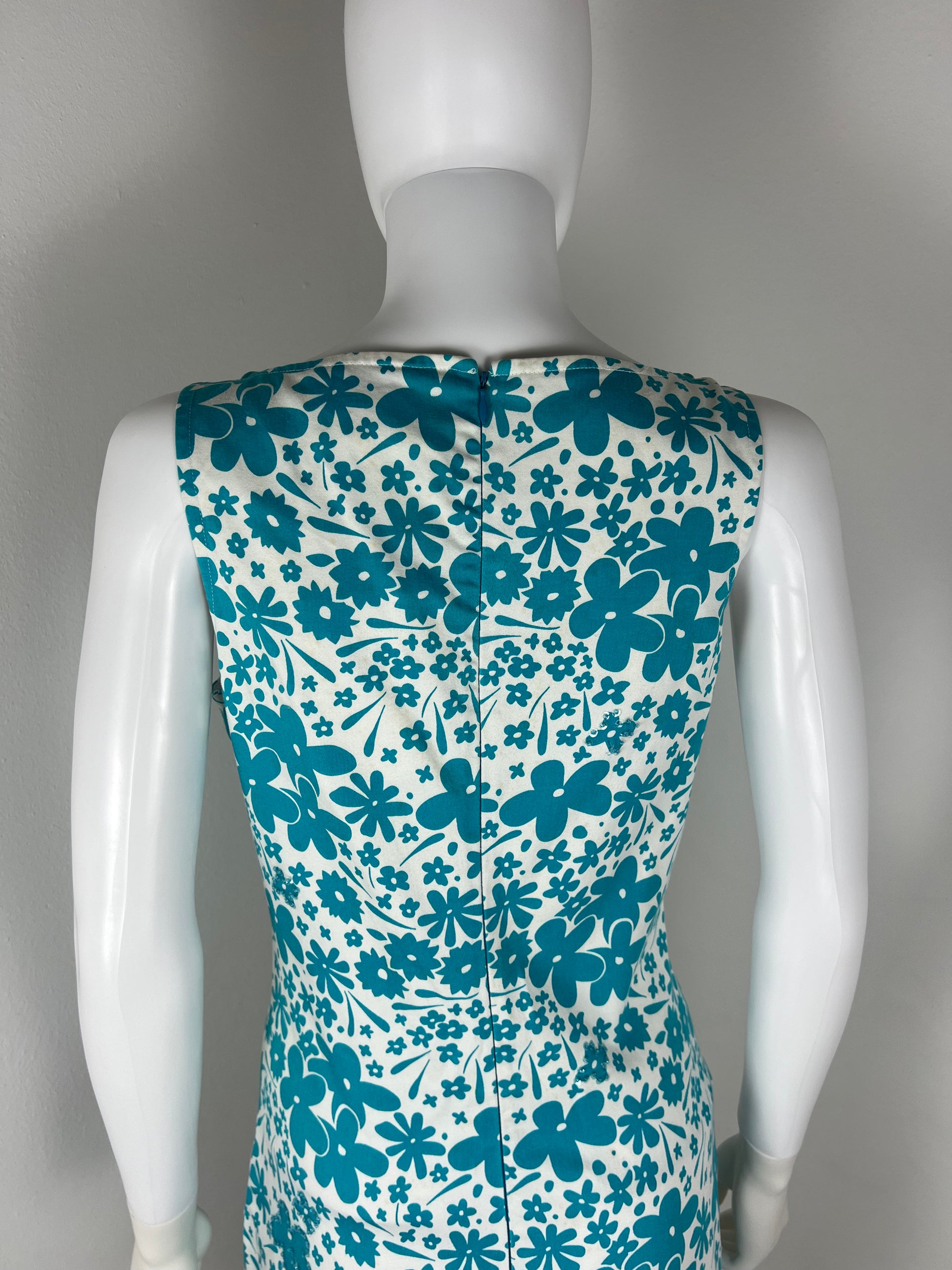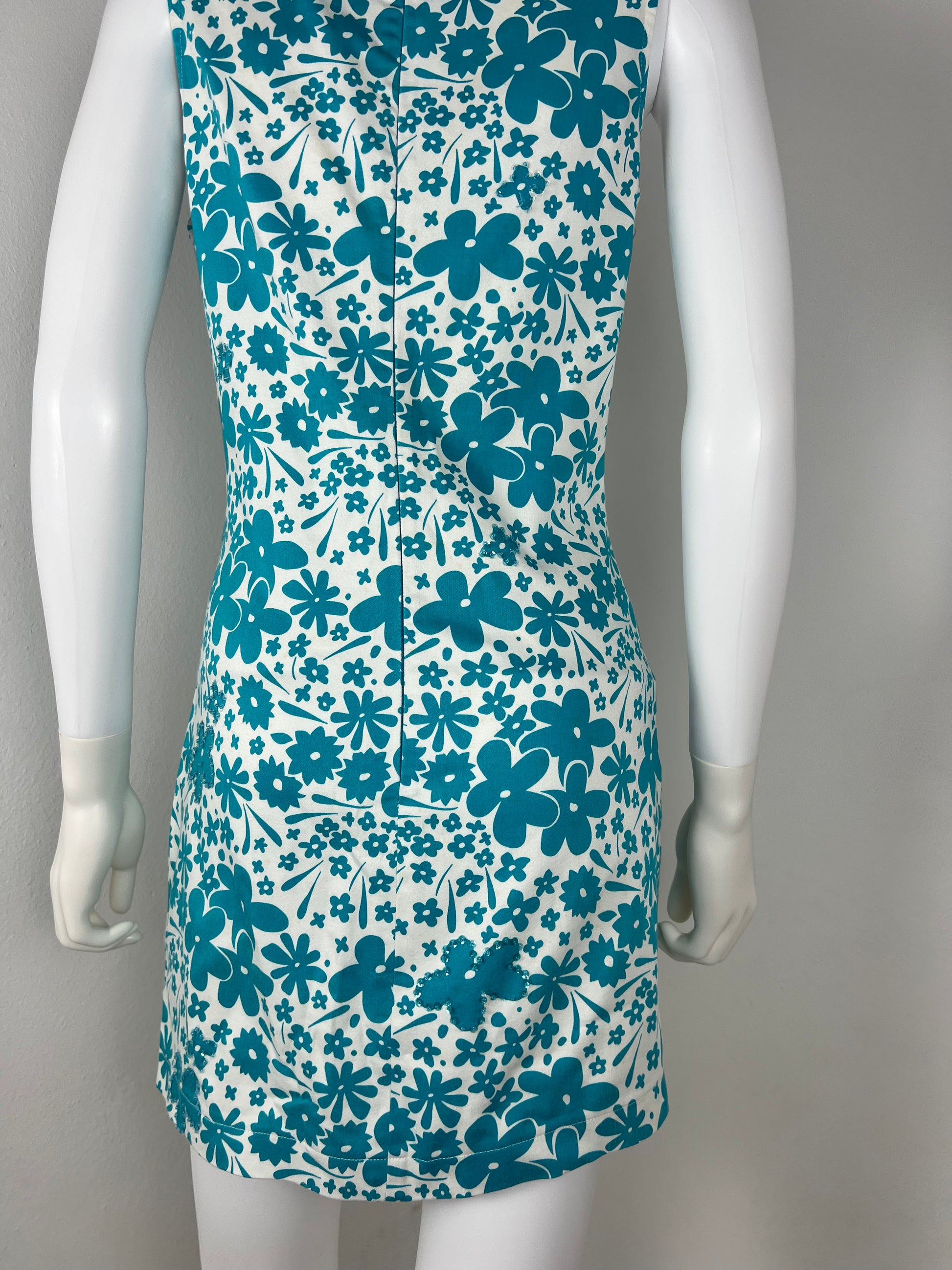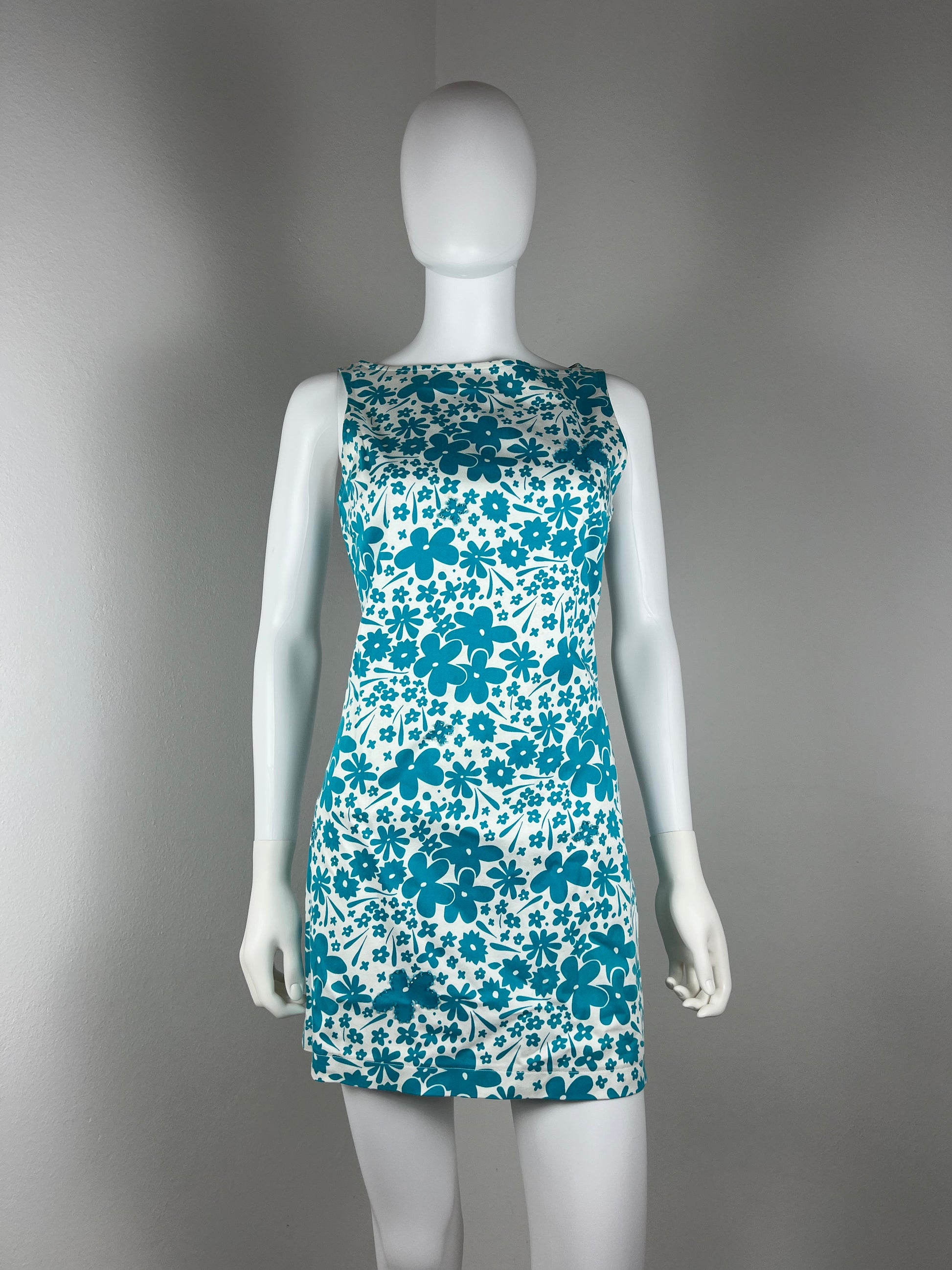 Electric turquoise floral minidress from the iconic Versus line under Gianni Versace. Features a 60s-mod cut with a bold floral print and a statement back zip in matching cobalt. Made in Italy.