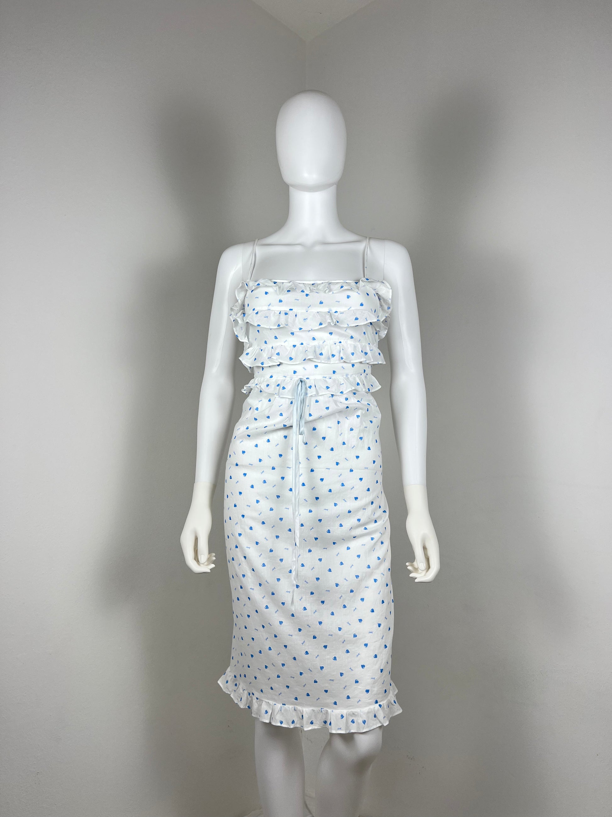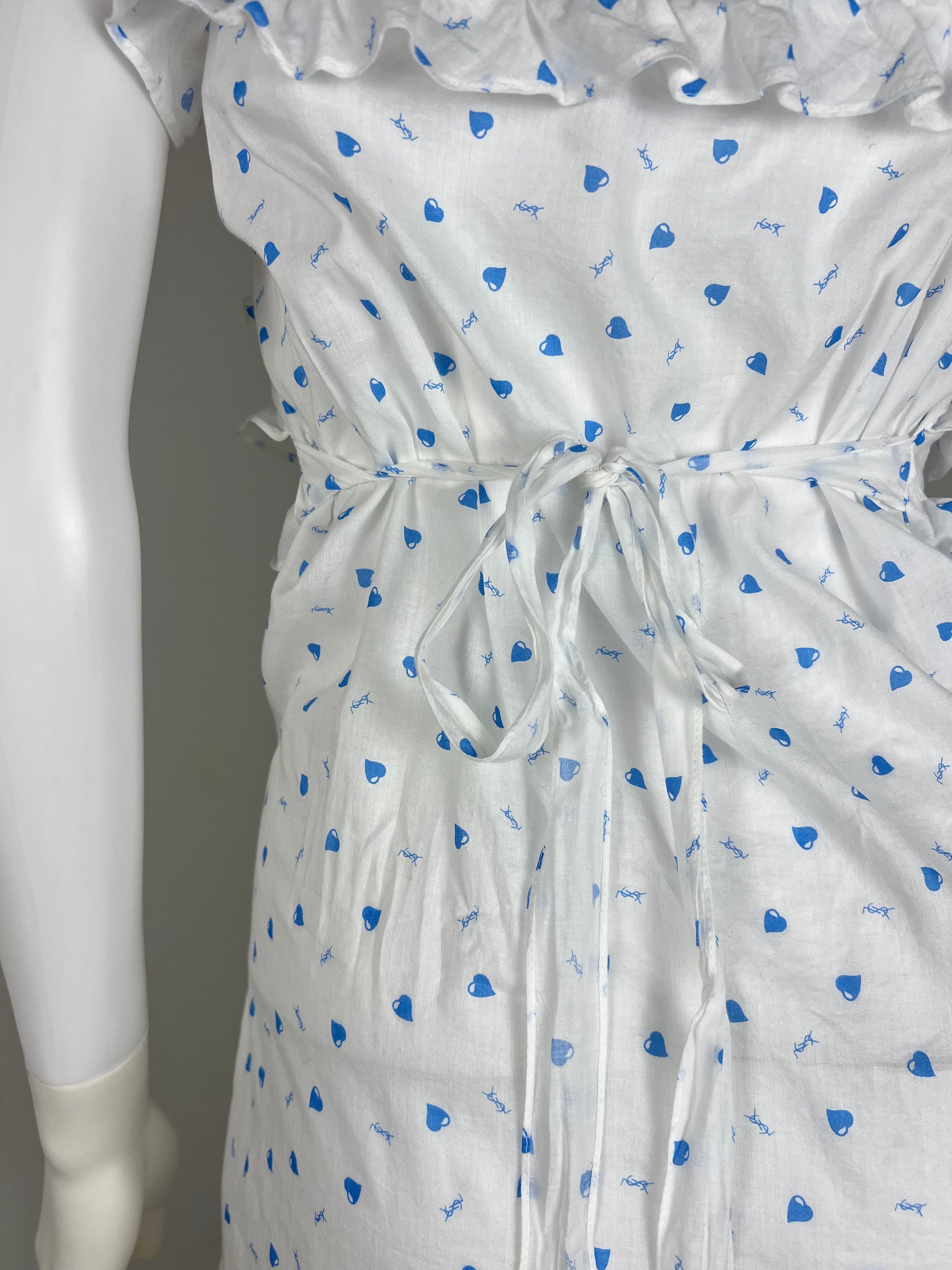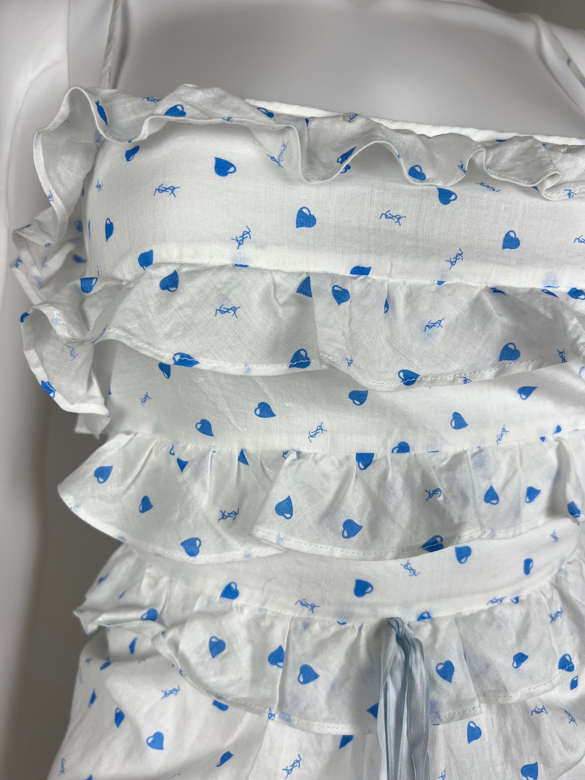 Late 1990s to early 2000s Yves Saint Laurent lingerie dress, designed to blur the line between intimate wear and ready to wear. Crafted in lightweight cotton with a scattered blue heart motif and fine YSL signatures throughout, the dress features delicate straps, tiered ruffle detailing through the bodice, a softly adjustable drawstring waist, and a ruffled hem. Romantic and understated, it is a collectible piece that works worn alone or layered with tailoring.